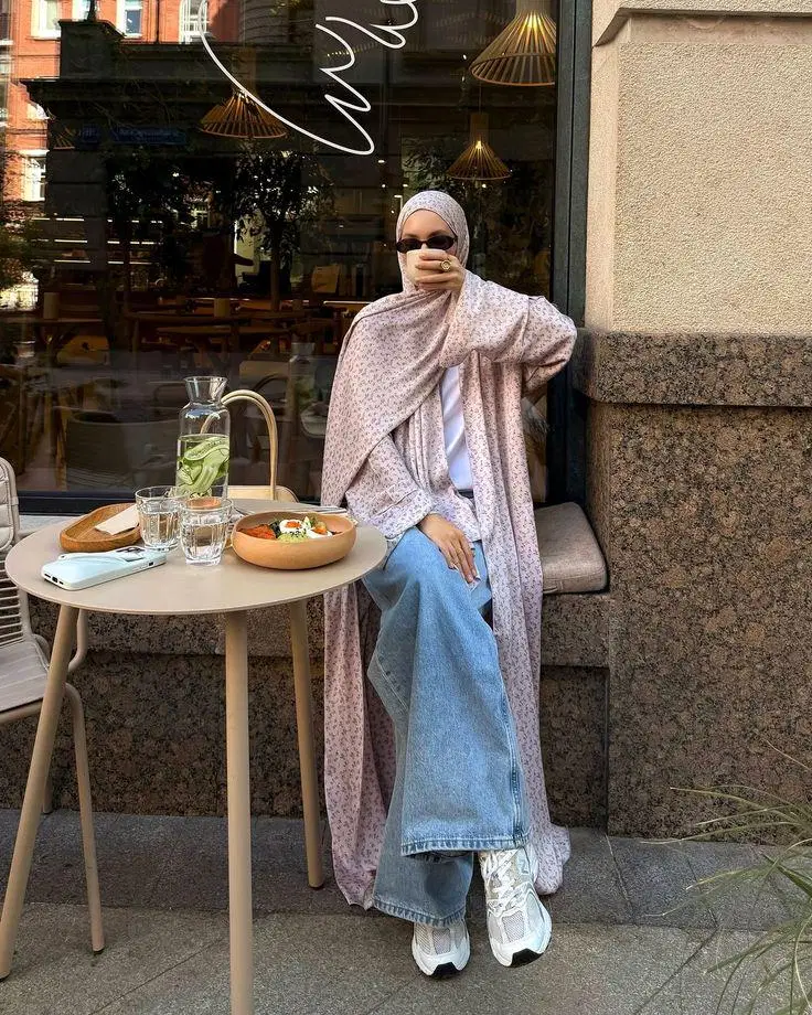 Buat yang pengin gaya santai, tapi tetap tertutup, abaya longgar bisa dipakai. Kamu bisa memakainya sebagai atasan panjang untuk dipadukan dengan jeans. Jeans memberi kesan kekinian, sementara abaya menjaga tampilan tetap sopan dan nyaman. Kamu bisa pilih abaya dan pashmina senada supaya terlihat serasi. Pastikan abaya cukup panjang dan tidak ketat, lalu pilih jeans potongan lurus agar tetap rapi.