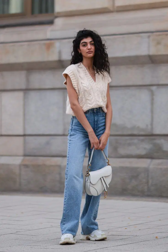 Outfit jalan-jalan yang pertama memadukan antara V-neck vest warna putih tulang dengan high waist jeans nuansa biru yang sama-sama cerah. Perpaduan keduanya akan memberikan tampilan yang simpel dan clean, cocok dipasangkan dengan saddle bag dan sneakers nuansa putih juga.