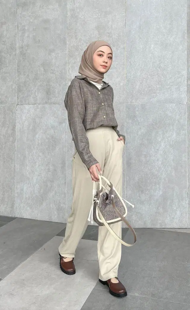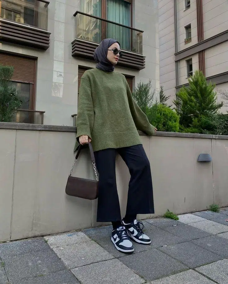 Bagi kamu yang berhijab, salah satu cara untuk membuat tampilan yang simpel adalah dengan memadukan antara sweater dengan wide leg pants. Pilihlah sweater yang berwarna seperti army, lalu padukan dengan bawahan yang bernuansa polos. Terakhir, lengkapi dengan sneakers dan shoulder bag sebagai aksesorinya.