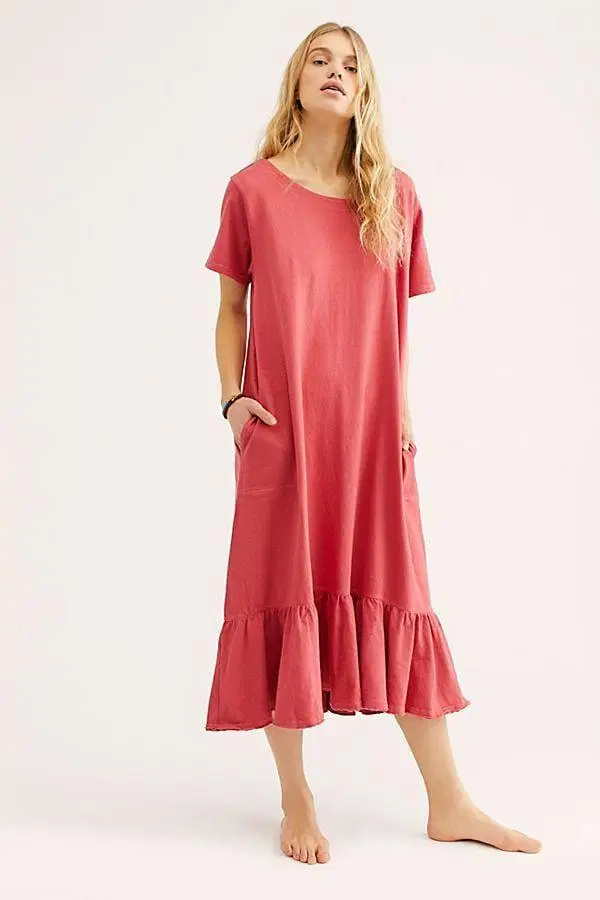 Hampir sama dengan daster sebelumnya yang polos dan lengan pendek, kali ini kamu bisa memilih daster dengan aksen ruffle di ujungnya. Aksen ruffle tersebut memberikan sentuhan kekinian khas remaja. Sementara itu, kantong bagian kanan dan kiri dibuat model saku dalam sehingga tidak terlihat dari depan. Lengkap dengan kerah u-neck, daster ini akan nyaman dipakai seharian.