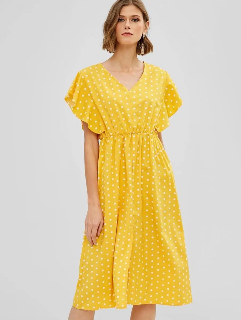 Daster remaja selanjutnya terlihat lebih ceria dan stylish dengan motif polkadot kuning dan detail kerah v-neck, Daster ini dibuat dengan panjang sampai bawah lutut yang pas untuk ukuran pakaian rumah. Kemudian, bagian pinggang daster bisa diberi aksen kerut supaya tubuh tetap tampak langsing. Jangan lupa tambahkan lengan ruffle supaya lebih meriah.