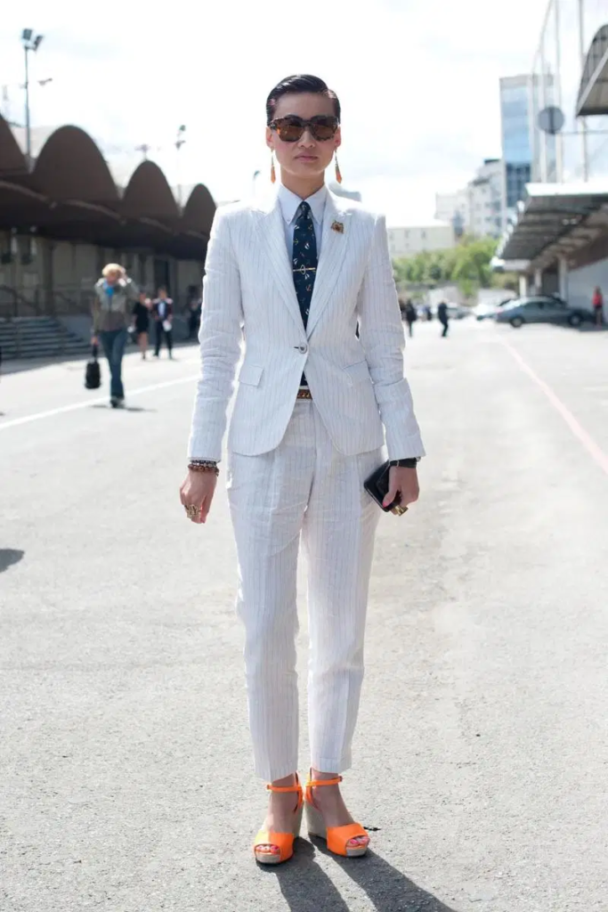Setelan jas putih identik dengan kesan rapi, bersih, dan formal. Namun, ketika elemen ini dipadukan dengan gaya yang tidak terduga, jas putih justru bisa menghadirkan tampilan yang quirky, unik, dan penuh karakter. Permainan tekstur, warna, maupun aksesori yang “ditabrakkan” dengan setelan jas putih mampu menciptakan gaya yang berani sekaligus menarik perhatian.