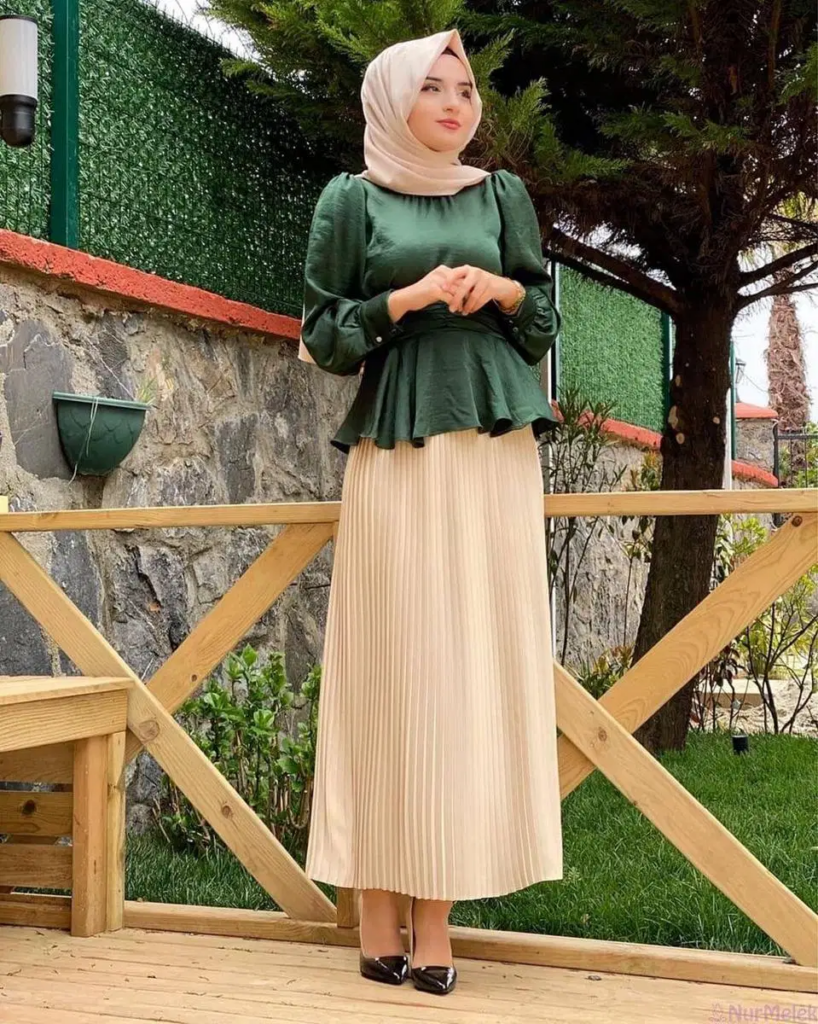 Kombinasi warna selanjutnya adalah perpaduan antara warna krem dan hijau botol. Krem sebagai warna yang terang akan menyeimbangkan penampilan dengan baju hijau botol yang cenderung gelap.  Supaya lebih match, kamu bisa mengenakan bawahan rok plisket warna krem yang sama dengan jilbabnya. Outfit ini akan cocok kamu pakai untuk kuliah atau mengajar.